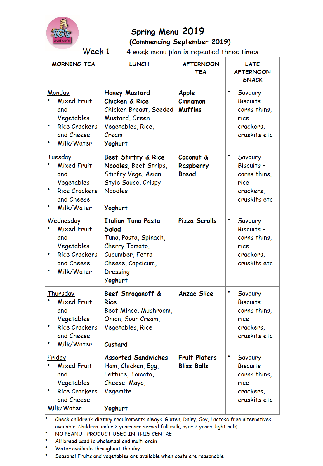 TG’s Meals are recognised by “Munch and Move” and “Good for Kids”. Our Nutritional program ensures the menu rotates on a 4 week cycle and is seasonal (changed every 3 months).